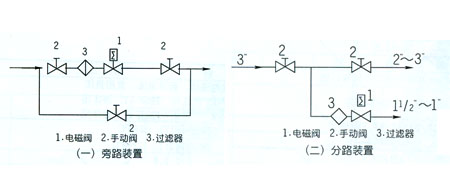 3、在電磁閥發(fā)生故障時,為了及時隔離電磁閥,并保證系統(tǒng)正常運行,最好安裝旁路裝置。如圖(一)。注意:旁路上的閥門平時須關閉。如果電磁閥安裝在支架上,電磁閥的通徑應小于主管道上閥門的通徑。如圖(二)。